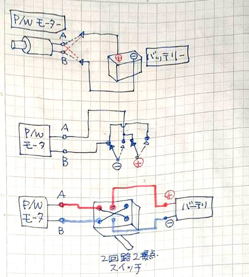 パワーWINDOWは、仕組みも何も、モータに電源をあたえてやるだけです。